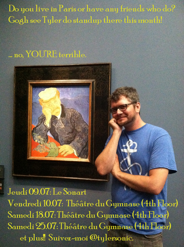Unfortunately, I don’t have any spare time to fill you in on how to came to be, but the long and short of it is that I was fortunate to receive a grant to spend the month in Paris for work and research. Also fortunately, in between the meetings and such I’ll be able to stop through some shows in the city’s wonderful English-language comedy scene. If you’re in town, come by and surprise me. If not, tell a friend who lives here. Merci.