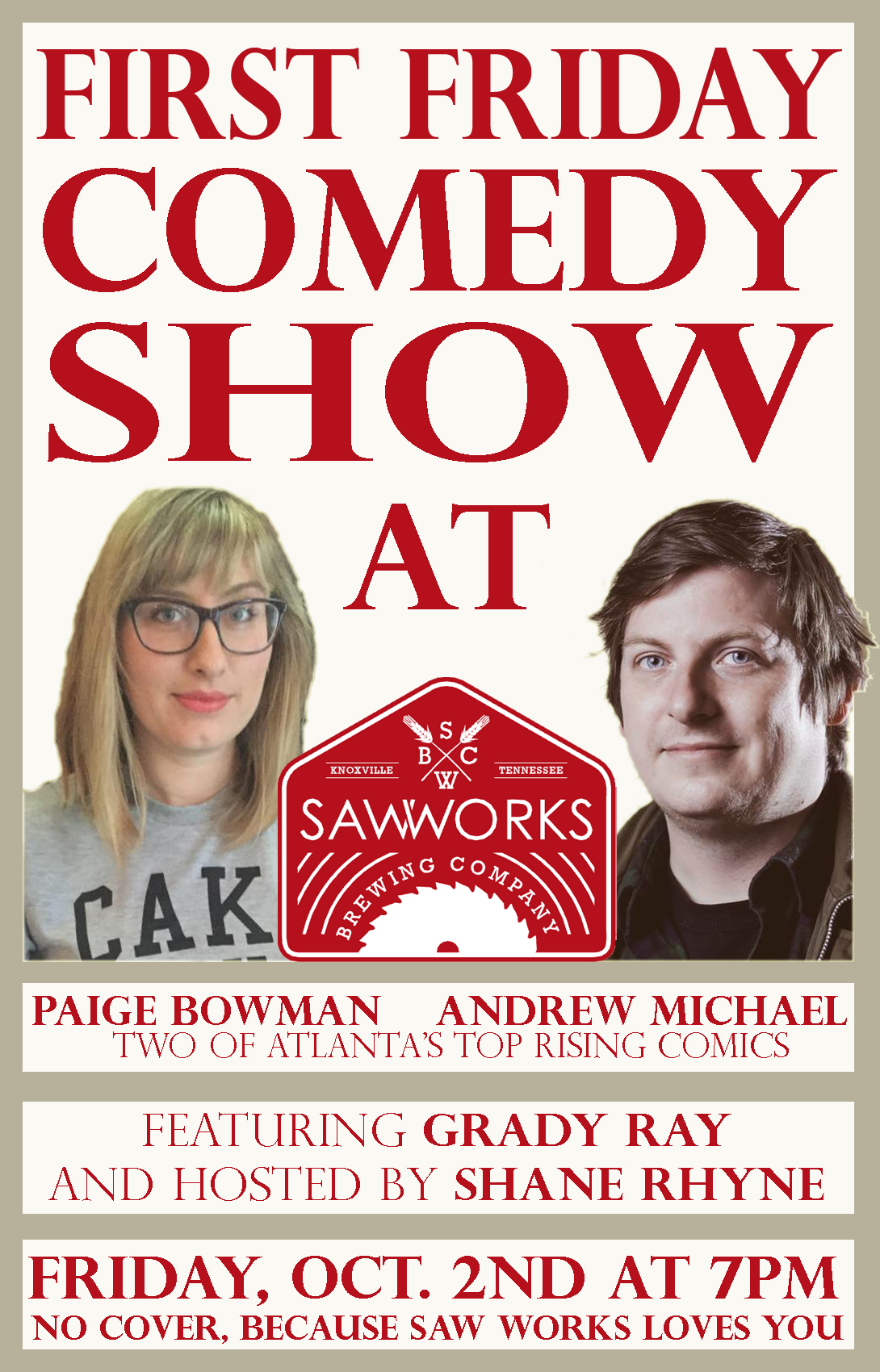 It is almost already time for the next First Friday Comedy Show at Saw Works!? Didn’t we just sort of have our most recent insanely good, standing-room-only show with Dave Losso and Alex Kumin from Chicago last month? Of course we did, but October 2 is the first friday of October, and this time around we’ve got a pair of wondercomics coming up from Atlanta – Paige Bowman and Andrew Michael! Grady Ray will be doing the local feature spot, and Shane Rhyne will be hosting. Based on the trend at these Saw Works shows, you may want to bring your own chair(s) to be safe. Facebook event coming soon, just for now, know that it’s happening at Saw Works at 7. Be there by 6:30 to get situated and drink delicious beer.